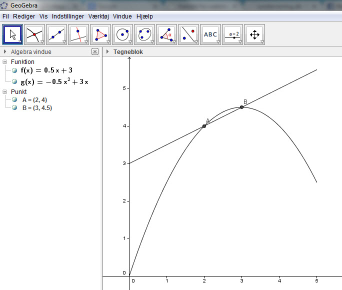 - Funktionen -0.5x^2+3x bliver således tegnet i intervallet [0 ; 5].
