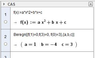 - Skriv Beregn[{f(1)=0,f(3)=0, f(0)=3},{a,b,c}]