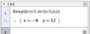 CAS-delen har også en mulighed for at beregne løsningen til ligninger med 2 eller flere ubekendte. Hvis vi fx har følgende 2 ligninger med 2 ubekendte x og y.