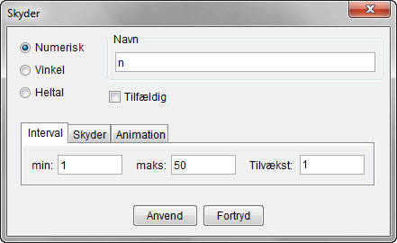 -værktøjet. Kald skyderen n, min. = 1, maks.=50 og Tilvækst=1.